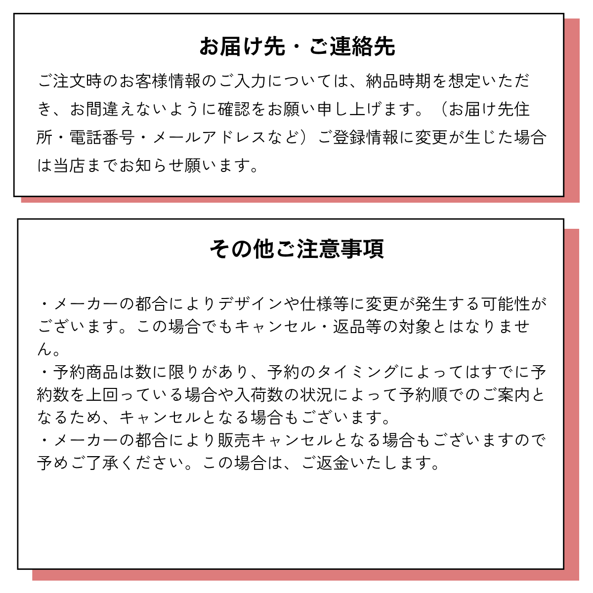 Please ensure your contact and shipping information (address, phone number, email) is accurate and valid for the time of delivery. If there are any changes to your registered information, please notify us immediately.