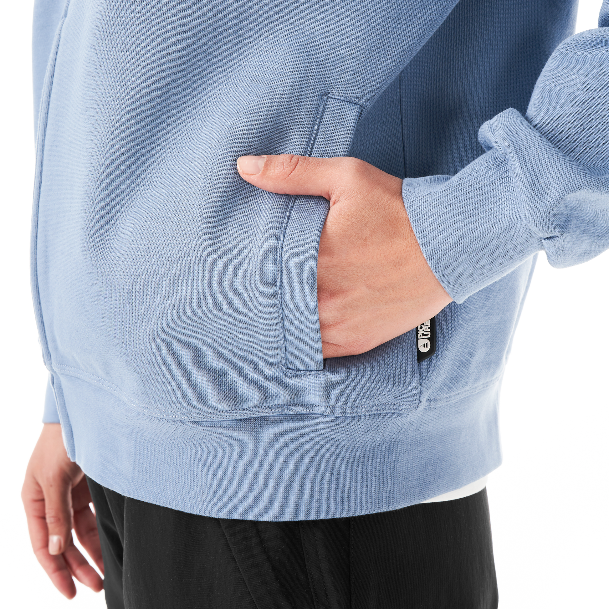 調節可能なフードとプリントされたアウトドアディテールが特徴の100%オーガニックコットンジップアップフーディー