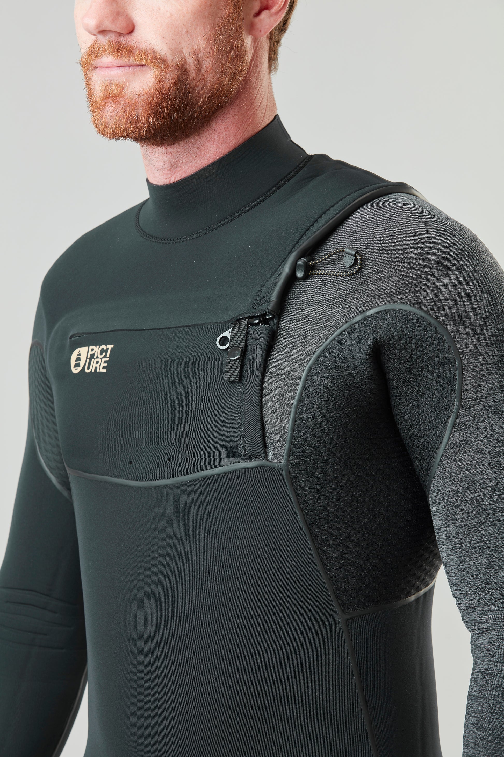 腕の可動域に伸縮性の高い素材を採用し、パドリングなどの動作を妨げず快適