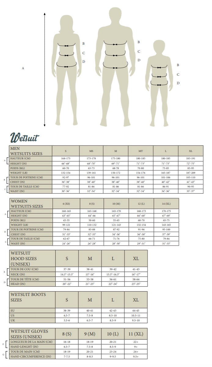 胴体部分が5mm厚、手足が4mm厚の長袖・長ズボンタイプのウェットスーツ