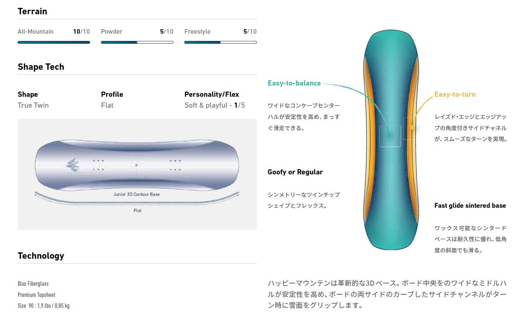 Happy Mountain(ハッピーマウンテン)は、ボードとバインディングが一緒 になったパッケージで、若いライダーが簡単にスライドやグライドを楽しめ るように設計されています。安定感のある独自の3D ベースを採用し、バインディングがあらかじめ取り付けられているので、箱から出してすぐに使えま す。さらに、牽引用の巻き取り式トウリールも付属しており、上り坂では引っ張り、下り坂ではスピードの調整が可能です。