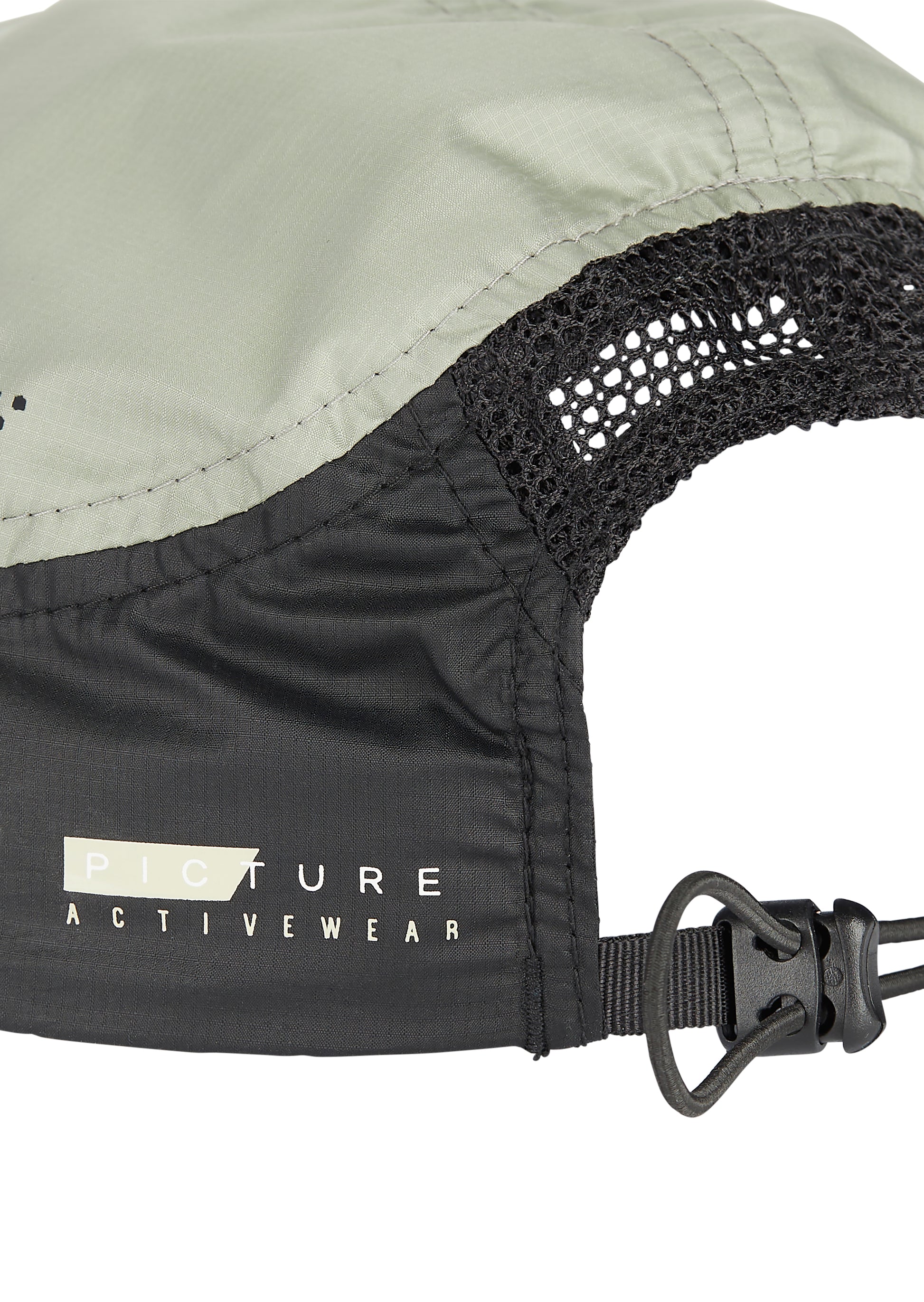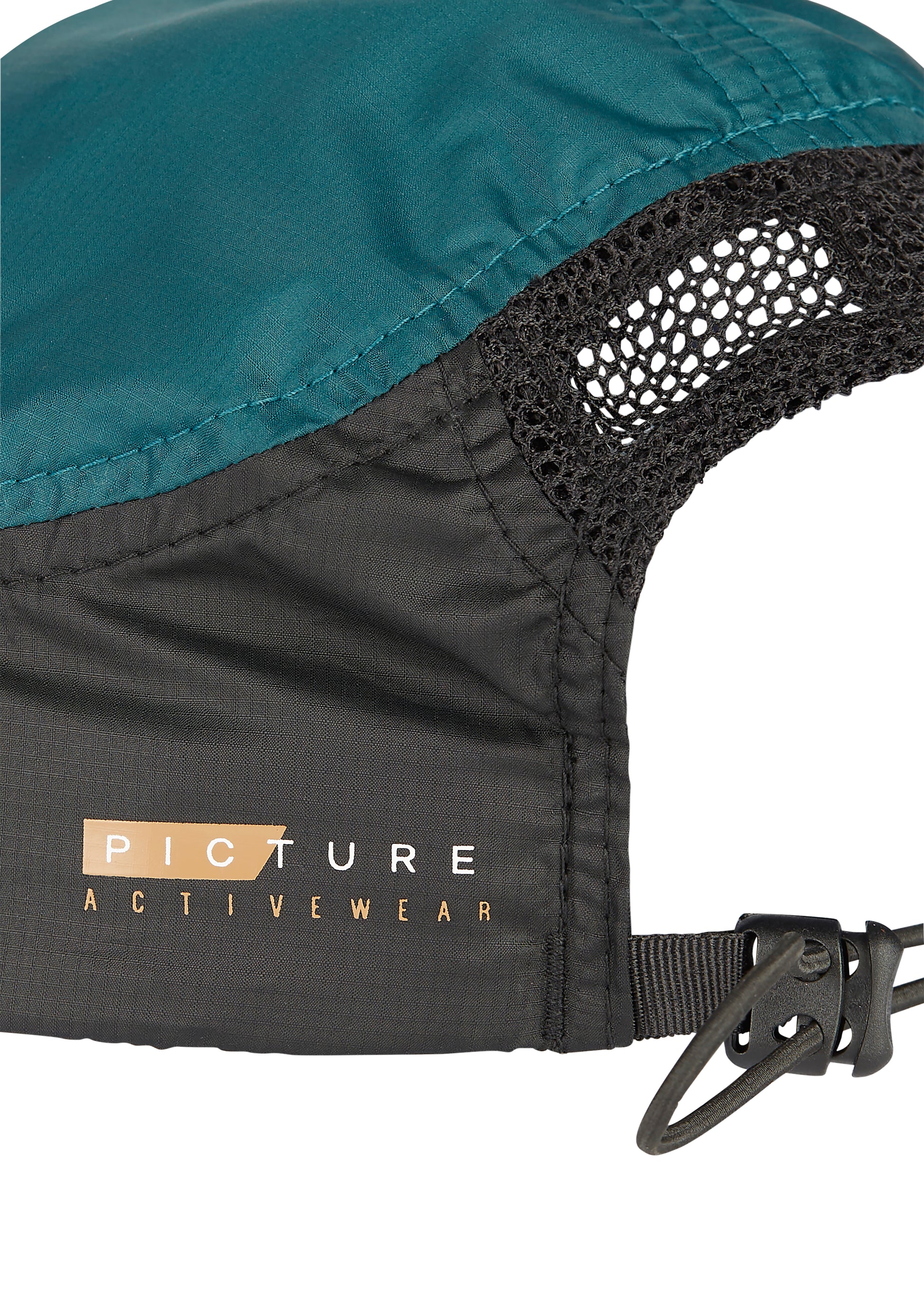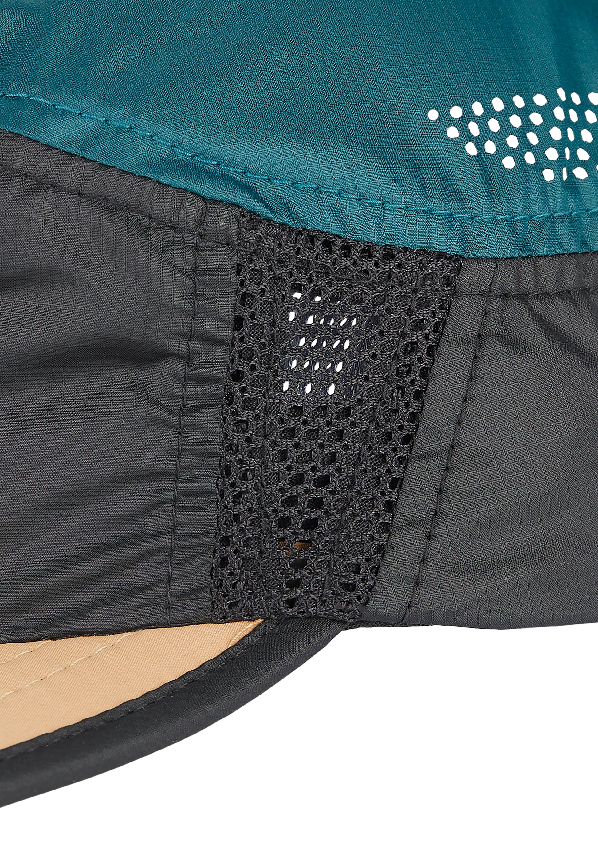 通気性の良いメッシュパネルとソフトなバイザーを備えたテクニカルな5パネルキャップ